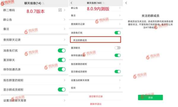 與微信8.0.8 for iOS版本一樣,當(dāng)微信群處于“消息免打擾”狀態(tài)時(shí),通過(guò)微信群聊右上角的“...”,下劃即可看到新增的“關(guān)注的群成員”入口。將群成員設(shè)為關(guān)注后,該成員在群內(nèi)發(fā)消息時(shí)會(huì)以紅色的“【關(guān)注的人】”字樣提醒你關(guān)注,不受到免打擾的影響。需要注意的是,最多只能設(shè)置關(guān)注4個(gè)群成員。