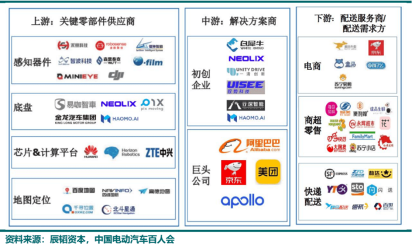 在初步成型的產業鏈中,上游是硬件和零部件供應廠商,涵蓋線控底盤、激光雷達、攝像頭、計算平臺等等,出現了禾賽科技、地平線、毫末智行等企業;中游是解決方案公司,一類是阿里巴巴、京東、美團等基于場景進場的互聯網巨頭,一類是白犀牛、新石器、行深智能、毫末智行等有自動駕駛研發和技術背景的創業者;下游是電商、商超、快遞、外賣、本地生活等配送需求方。