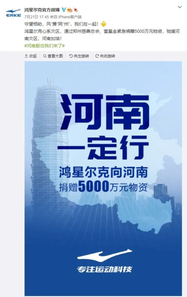 一波未平一波又起,這兩天大家恐怕都被鴻星爾克的捐款義舉刷屏了。7 月 21 日,為馳援災區,鴻星爾克通過鄭州慈善總會、壹基金緊急捐贈 5000 萬元物資。