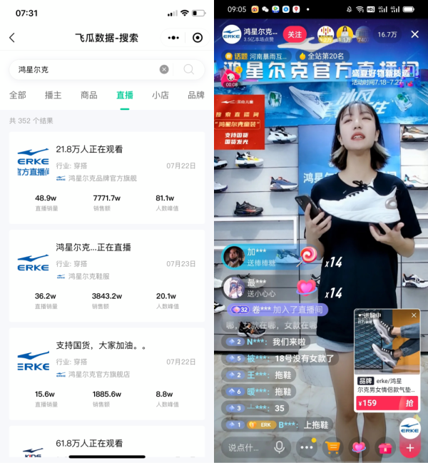 平時穩定在千人左右的直播間,瞬間涌入上百萬人觀看,目前所有在售貨品已被網友全部掃光。在抖音連續直播近48小時后,鴻星爾克3個直播間的累計銷售額超過1.7個億。