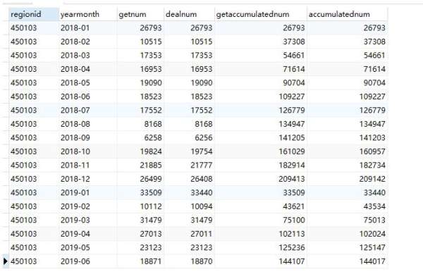WITH yms AS (SELECT regionid,SUM(getnum) AS getnum,SUM(dealnum) AS dealnum,to_char(qndate,'yyyy-MM') AS yearmonth